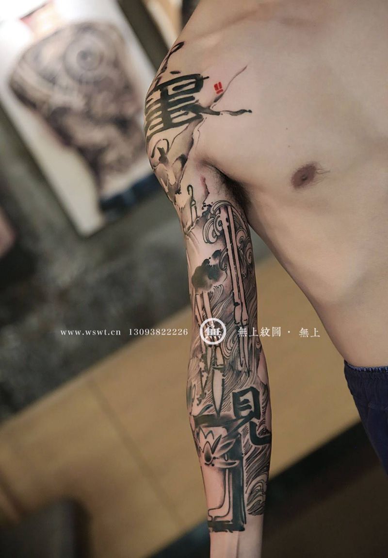 当前位置: 首页 >浙江省台州市纹身店-无上纹图纹身图案>无上水墨书法 —— 笔墨纸砚纹身纹身图片_手臂传统原创图腾无上纹图书法水墨纹身图案