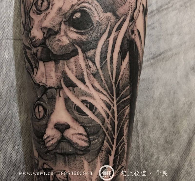 无毛猫纹身图片_成品腿部动物遮盖纹身图案