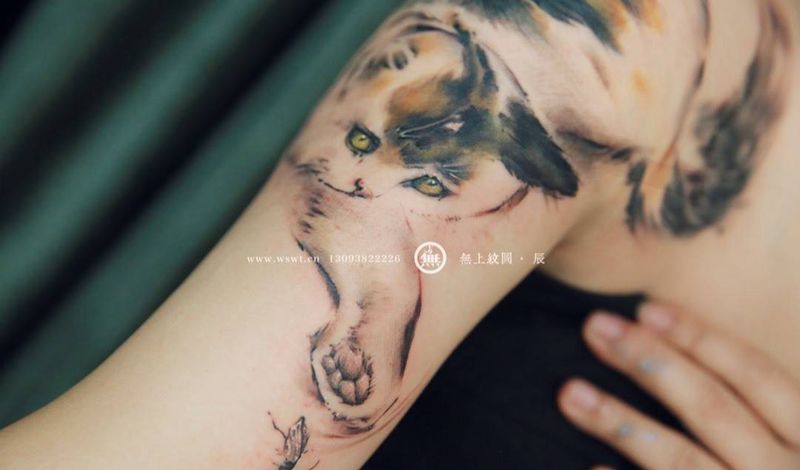当前位置: 首页 >浙江省台州市纹身店-无上纹图纹身图案>猫咪纹身图片_成品肩部欧美清新写实动物原创无上纹图培训纹身图案