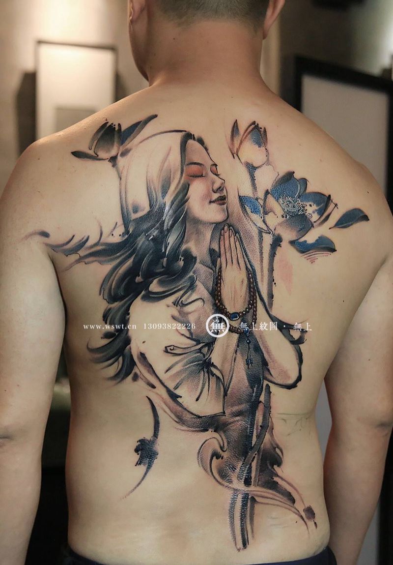 满背肖像纹身图片_成品背部肖像清新人物原创无上纹图水墨纹身图案
