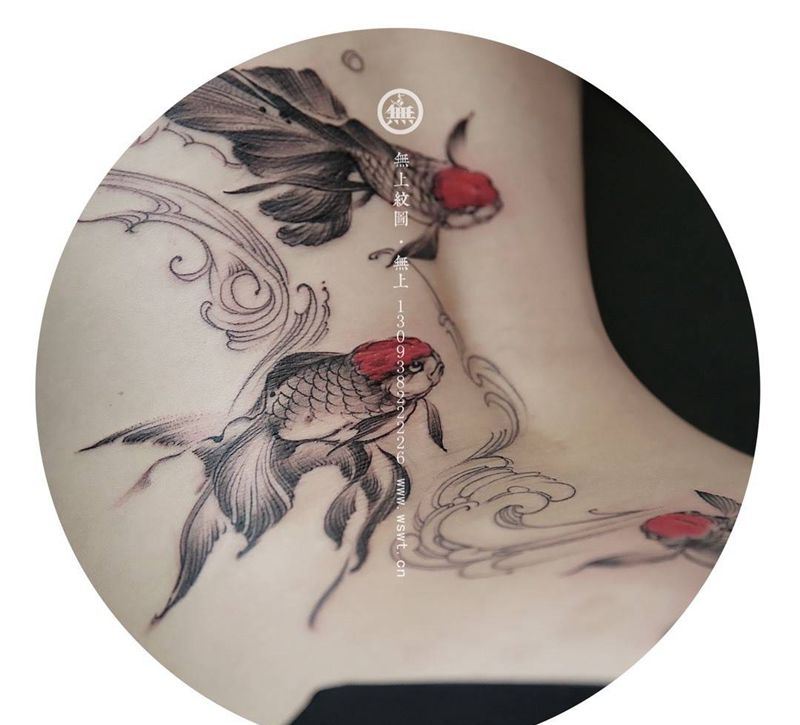 金鱼遮盖未完成纹身图片_成品背部清新传统习俗动物原创无上纹图水墨学习纹身图案
