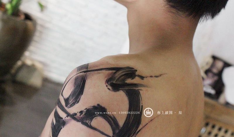 书法纹身纹身图片_成品肩部传统培训书法水墨纹身图案