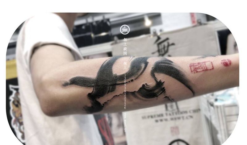 当前位置: 首页 >浙江省台州市纹身店-无上纹图纹身图案>书法纹身纹身图片_成品手臂清新传统字符原创无上纹图书法水墨纹身图案