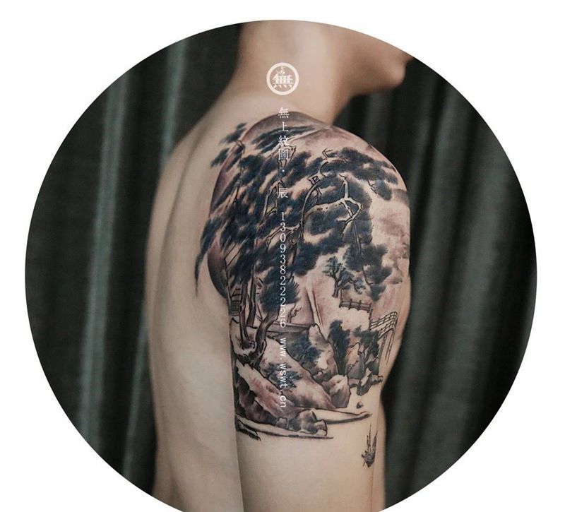肩部山水遮盖纹身图片_肩部手部传统成品静物无上纹图水墨纹身图案