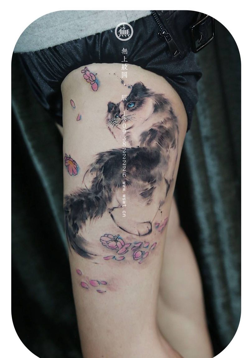 大腿/猫纹身图片_成品腿部动物传统无上纹图水墨纹身图案