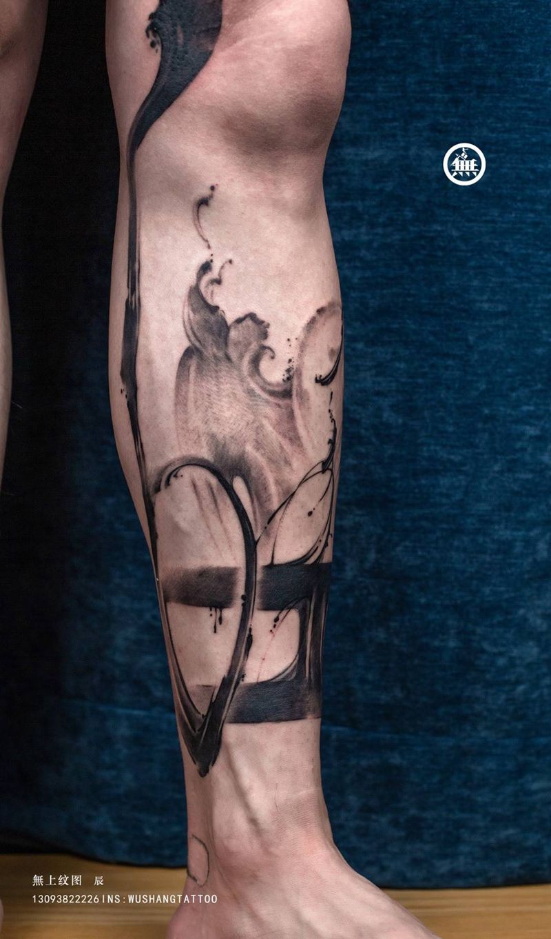 当前位置: 首页 >浙江省台州市纹身店-无上纹图纹身图案>泼墨风格小腿纹身图片_成品腿部无上纹图原创纹身图案