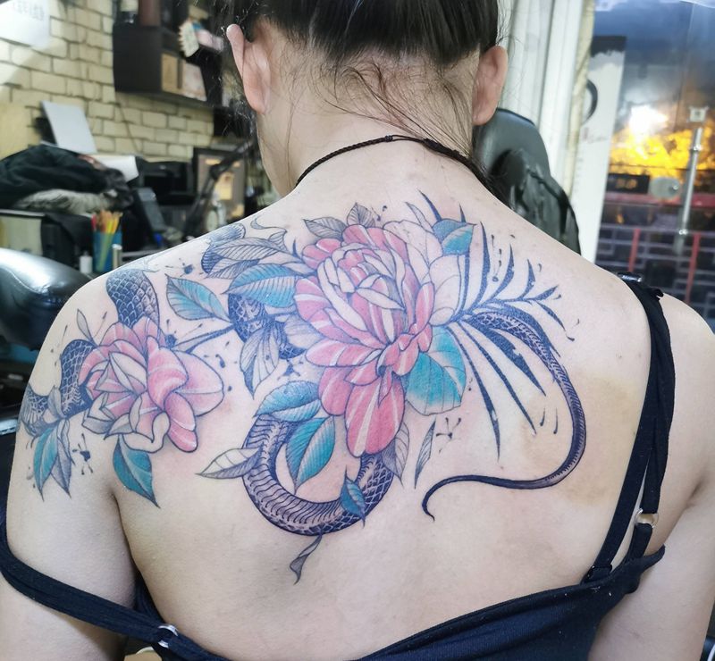 当前位置: 首页 >浙江省金华市纹身店-行者纹身纹身图案>蛇添加纹身图片_肩部背部新传统纹身图案