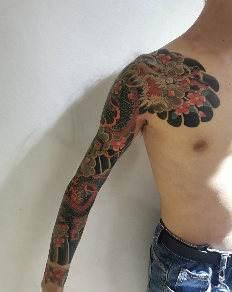 • T网红王老大花腿龙纹身图片_腿部新传统纹身图案