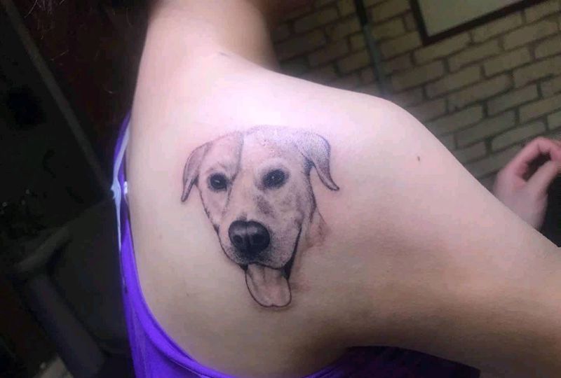 客人的爱犬纹身图片_背部肩部欧美写实纹身图案