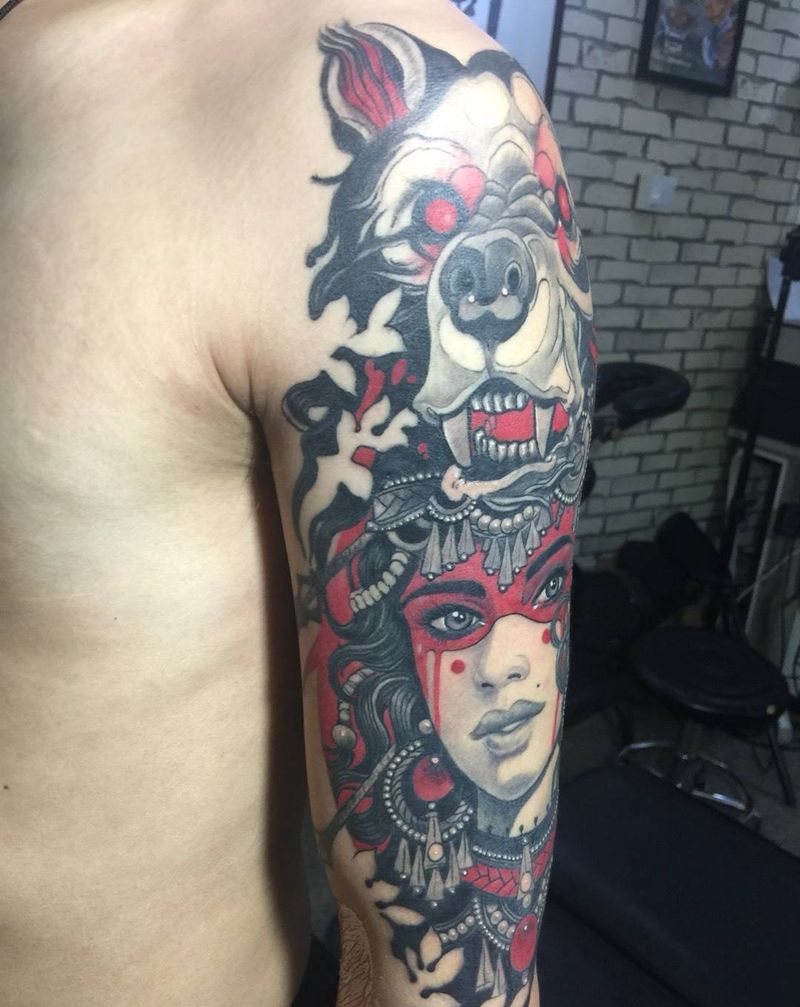 各式各样的风格花臂纹身图片_手臂欧美写实New School人物欧美成品纹身图案