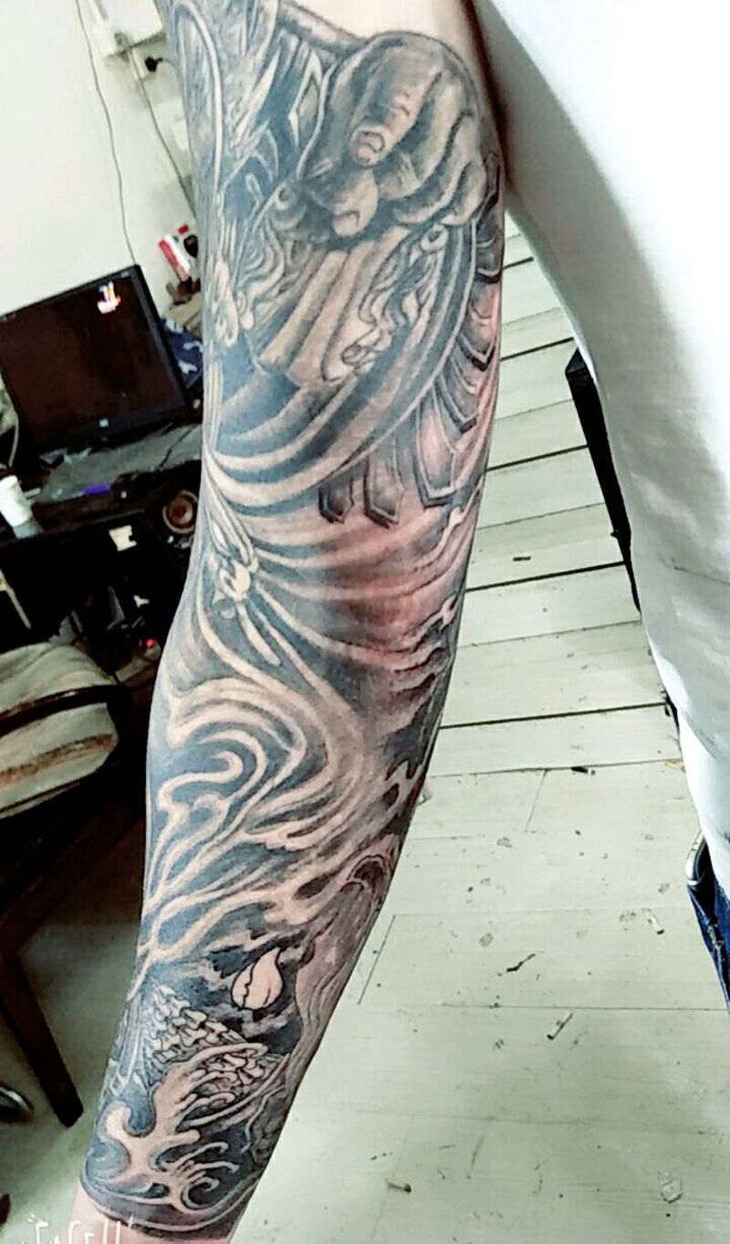 当前位置: 首页 >浙江省舟山市纹身店-舟山阿龙纹刺纹身图案>哼哈二将花臂未完工纹身图片