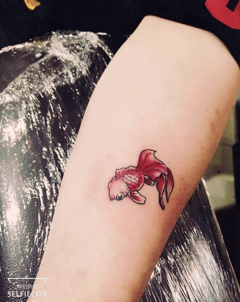 当前位置: 首页 >浙江省台州市纹身店-手艺人纹身工作室纹身图案>遮盖烟疤红色小金鱼一枚纹身图片