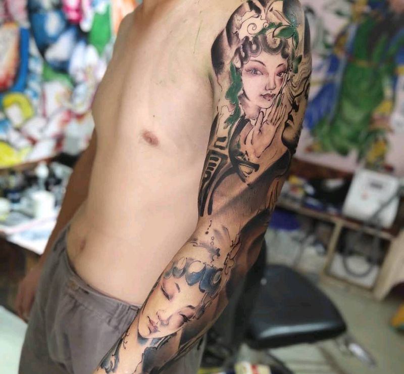 新中式水墨风格花臂拼接纹身图片_手臂水墨纹身图案