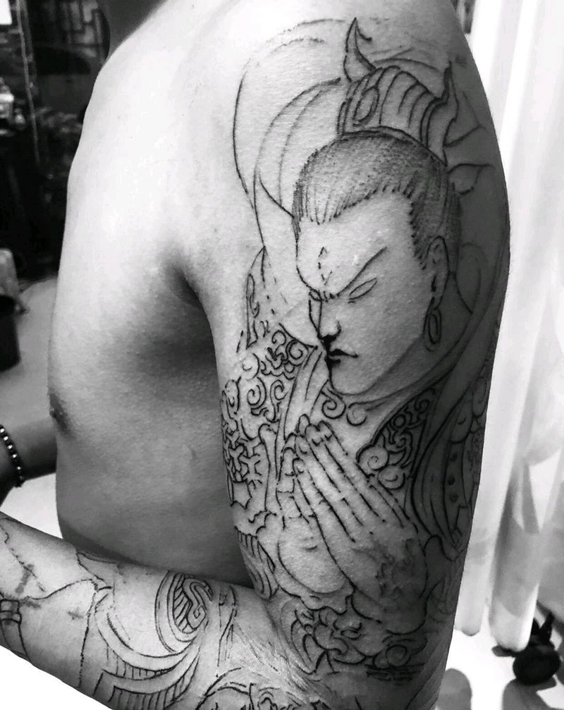 当前位置: 首页 >浙江省台州市纹身店-手艺人纹身工作室纹身图案>线条花臂、二郎真君、后加赵云纹身图片_手臂新传统纹身图案