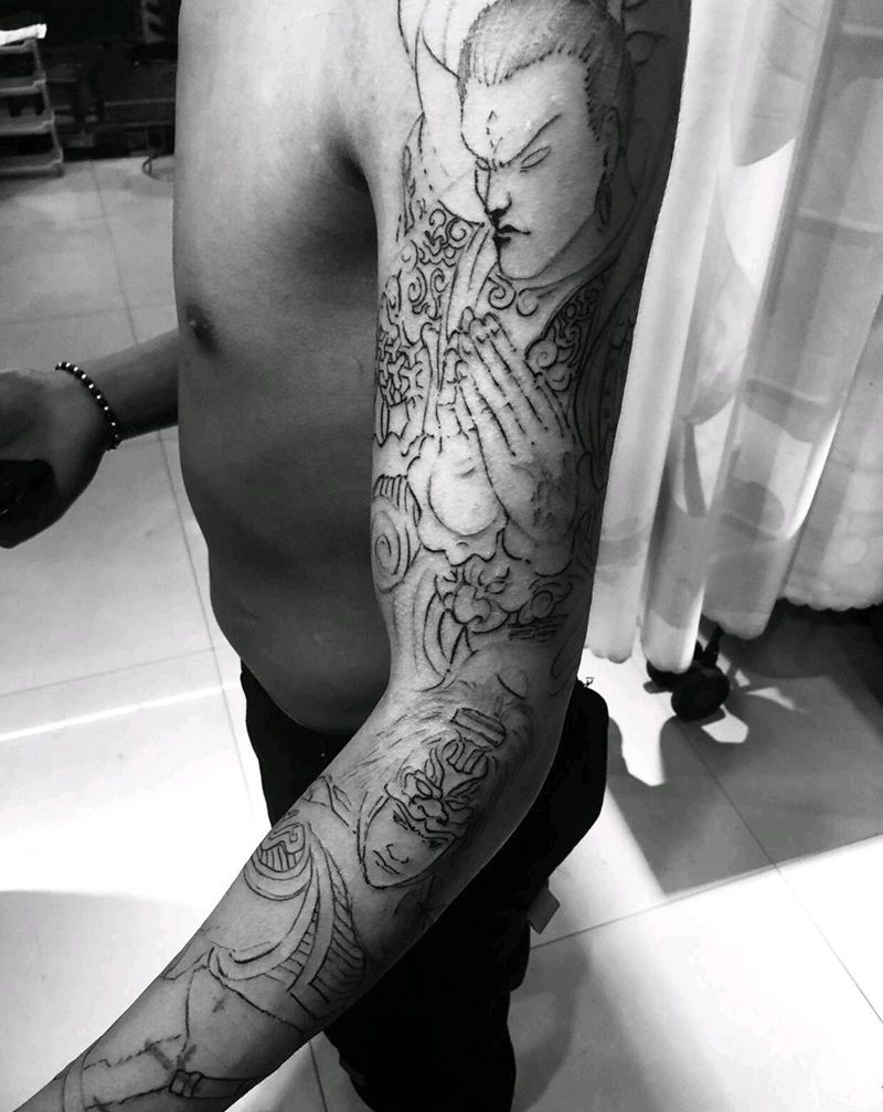 当前位置: 首页 >浙江省台州市纹身店-手艺人纹身工作室纹身图案>线条花臂、二郎真君、后加赵云纹身图片_手臂新传统纹身图案