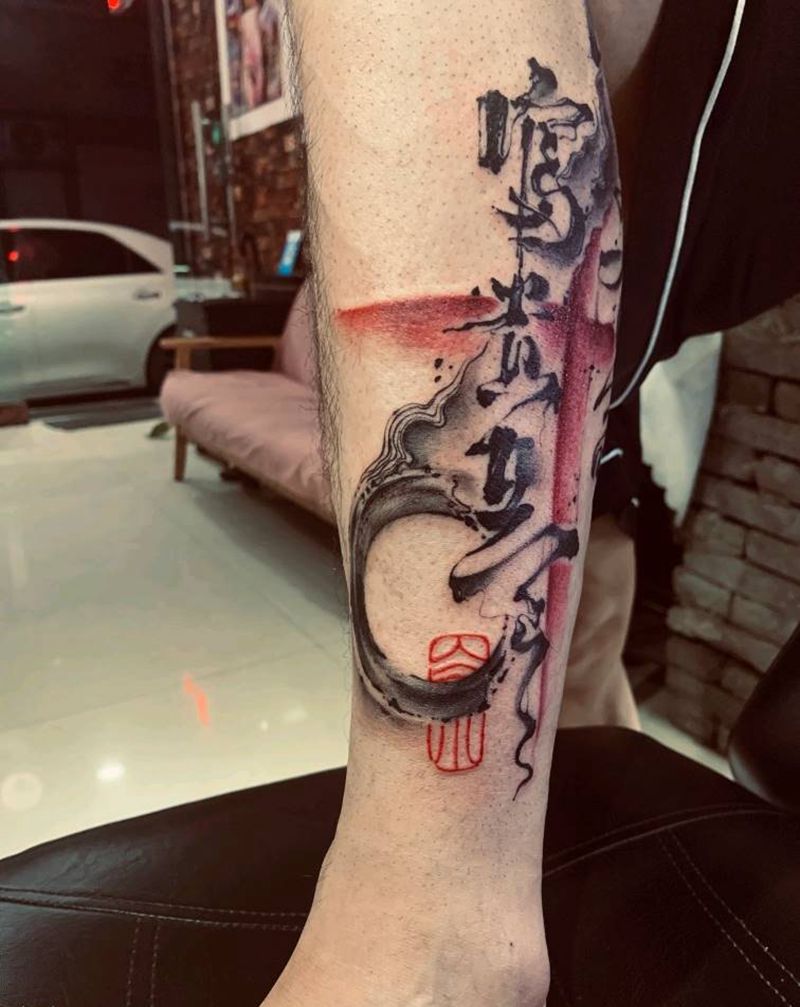生死有命·富贵在天纹身图片_腿部水墨纹身图案