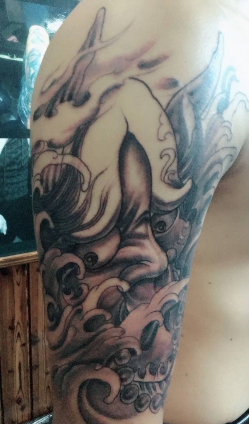 • T网红王老大花腿龙纹身图片_腿部新传统纹身图案