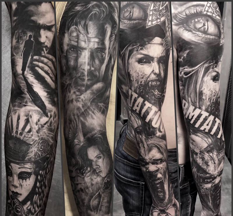 当前位置: 首页 >浙江省衢州市纹身店-拼搏刺青纹身图案>花臂纹身图片_手臂欧美写实Old School纹身图案