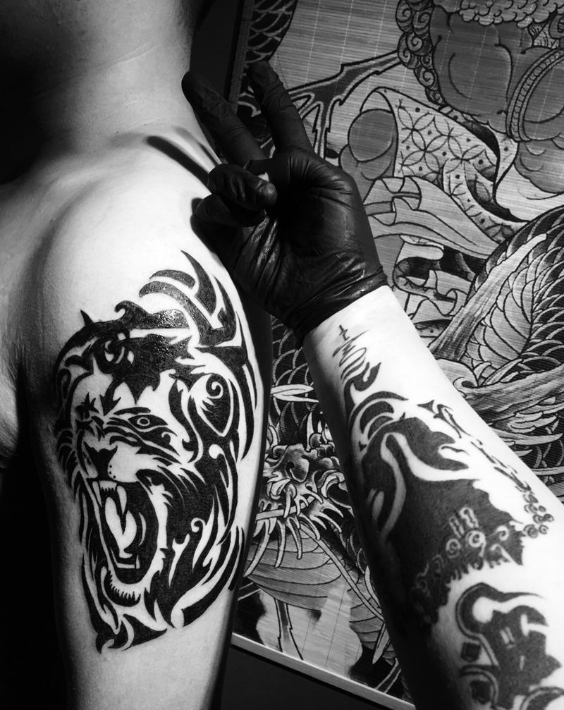 当前位置: 首页 >浙江省台州市纹身店-一念刺青工作室纹身图案>雄狮图腾纹身图片