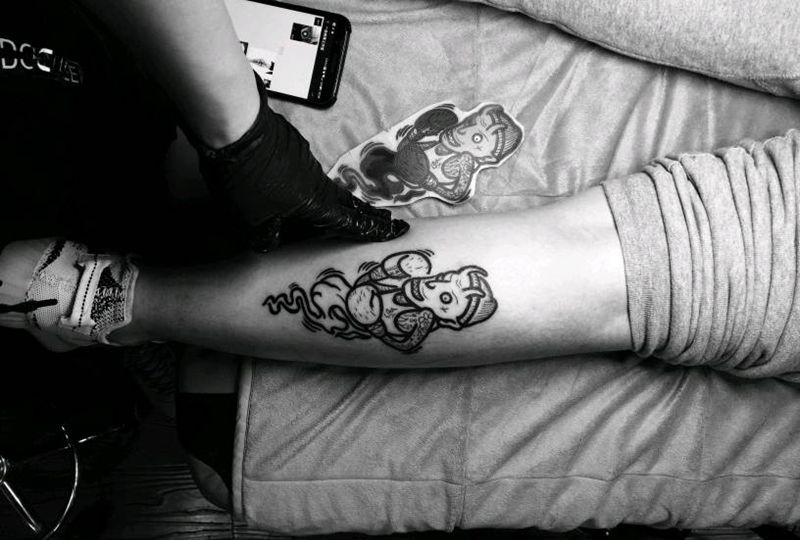 • T包小腿吹火男+阿多福纹身图片_腿部老传统新传统吹火男阿