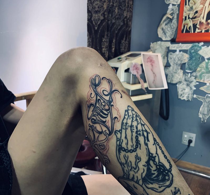 当前位置: 首页 >浙江省台州市纹身店-一念刺青工作室纹身图案>花体未完成纹身图片_腿部纹身图案