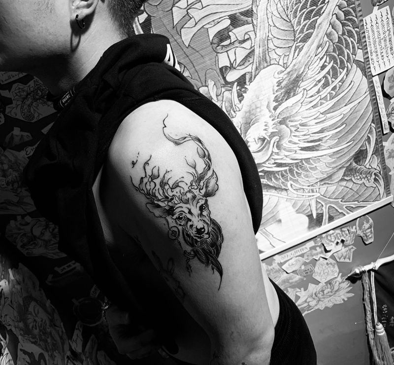 当前位置: 首页 >浙江省台州市纹身店-一念刺青工作室纹身图案>生财有鹿纹身图片_手臂纹身图案