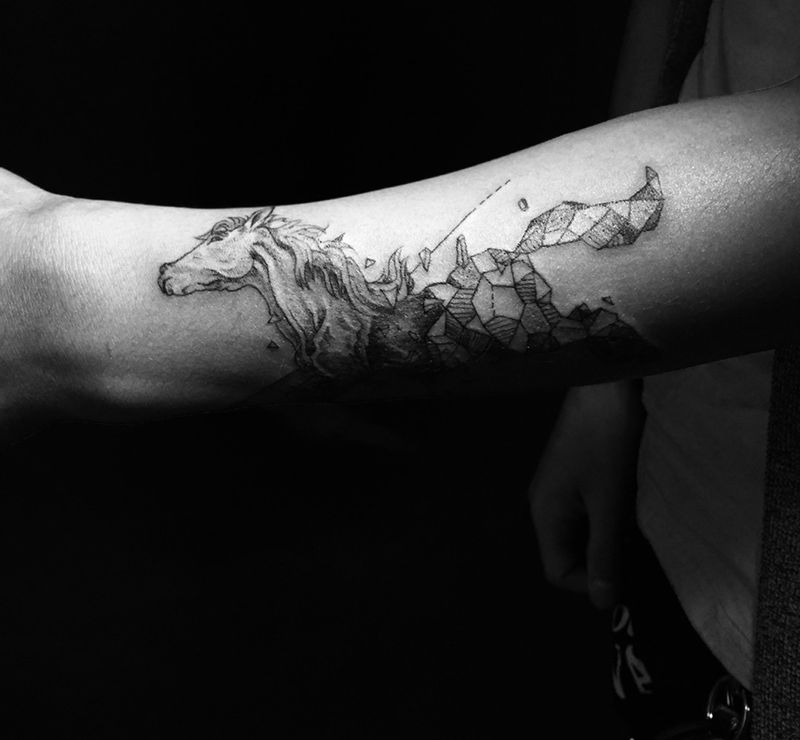 当前位置: 首页 >浙江省台州市纹身店-壹·刺青纹身图案>几何马纹身图片