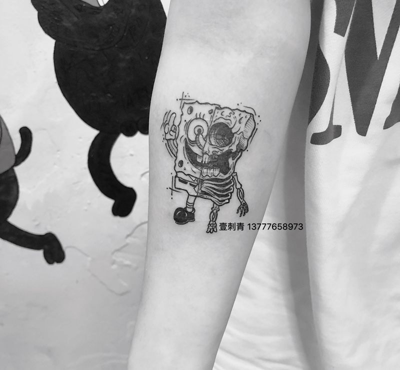 当前位置: 首页 >浙江省台州市纹身店-壹·刺青纹身图案>暗黑海绵宝宝纹身图片_手臂纹身图案