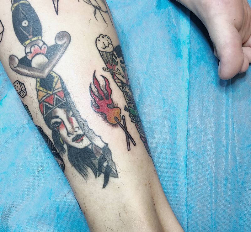 • T包小腿吹火男+阿多福纹身图片_腿部老传统新传统吹火男阿