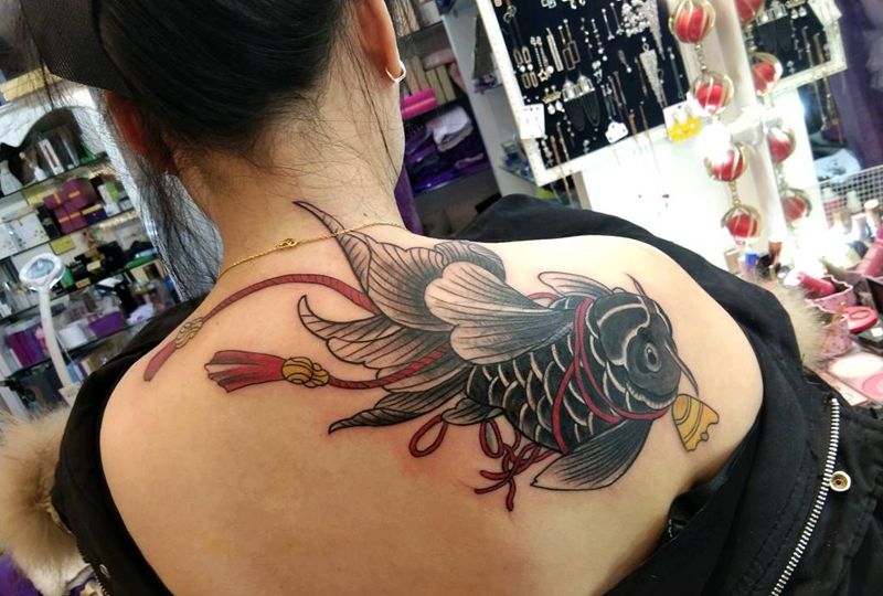 当前位置: 首页 >浙江省台州市纹身店-天道刺青纹身图案>遮盖老纹身纹身图片_肩部背部新传统老传统鱼 锦鲤纹身图案