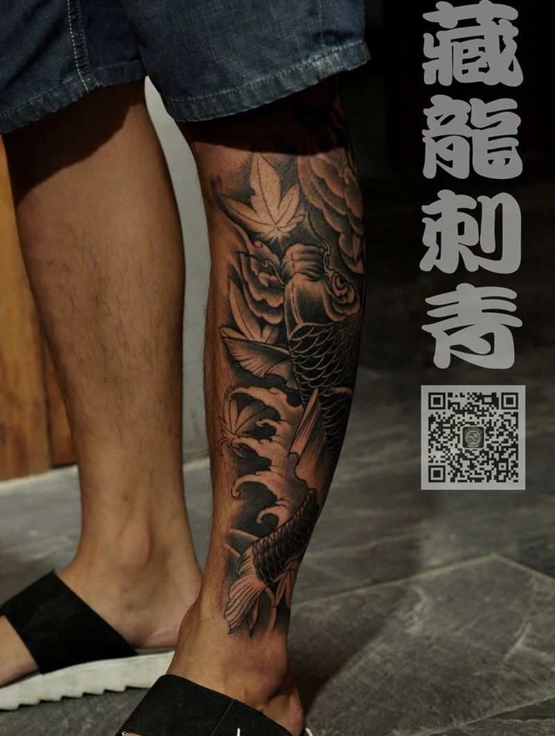 当前位置: 首页 >浙江省台州市纹身店-藏龙刺青工作室纹身图案>传统黑白鲤鱼包小腿纹身图片