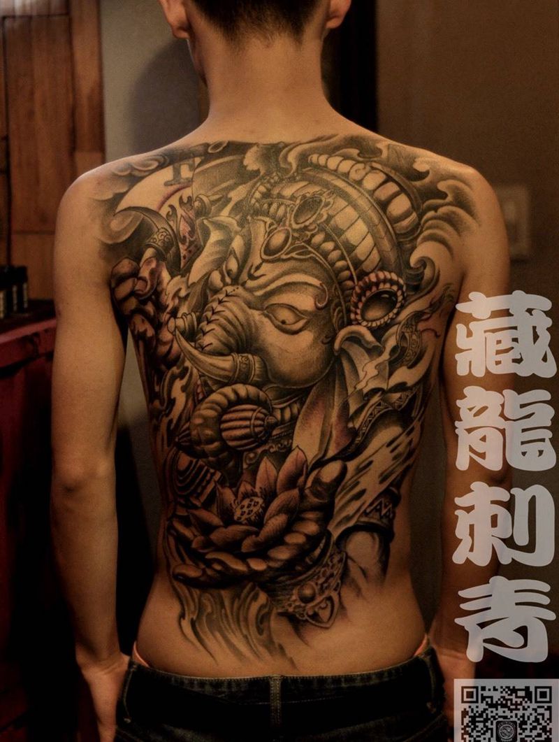 传统系列、黑白象神纹身纹身图片_成品背部传统宗教鬼神纹身图案