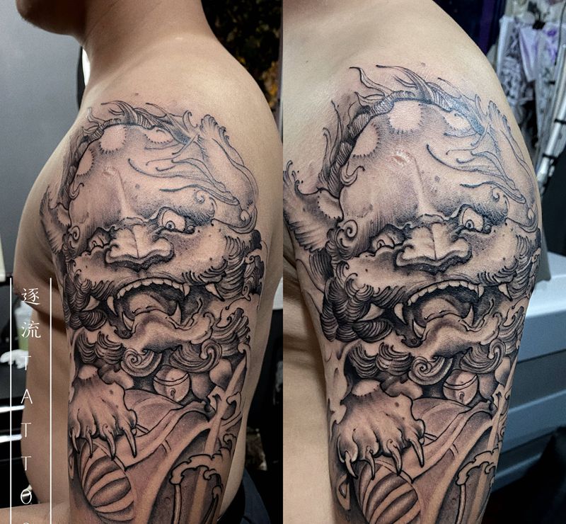 当前位置: 首页 >浙江省丽水市纹身店-逐流刺青纹身图案>唐狮纹身图片_手臂新传统纹身图案