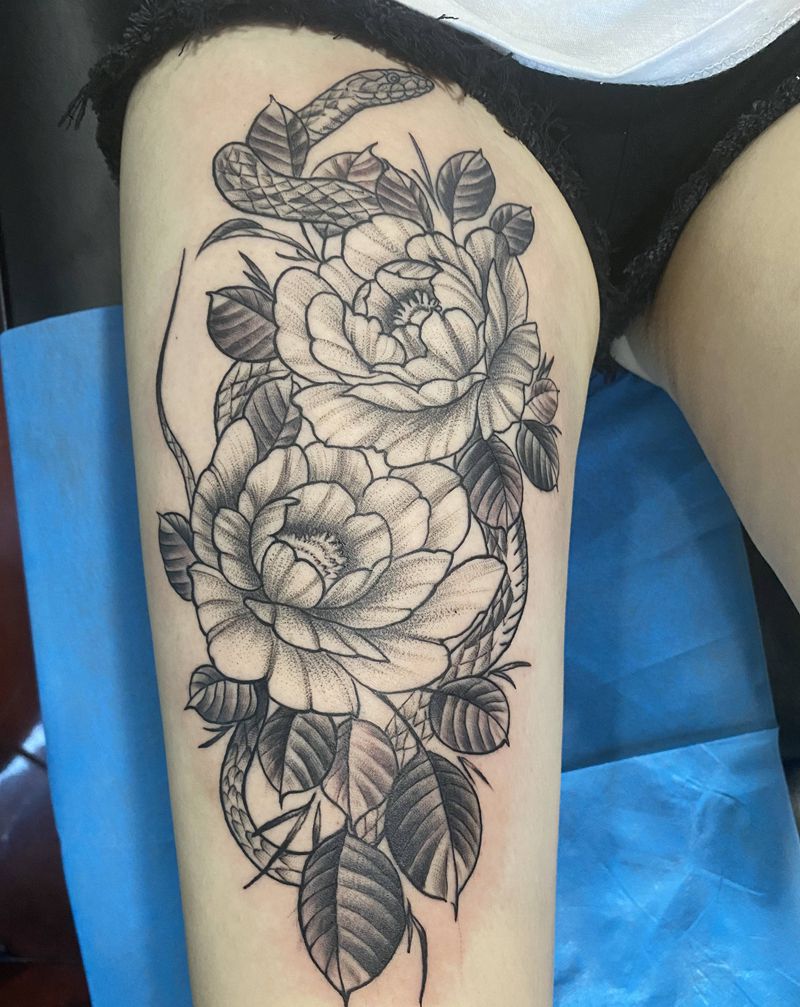 当前位置: 首页 >浙江省丽水市纹身店-逐流刺青纹身图案>素花与蛇纹身图片_腿部点刺纹身图案