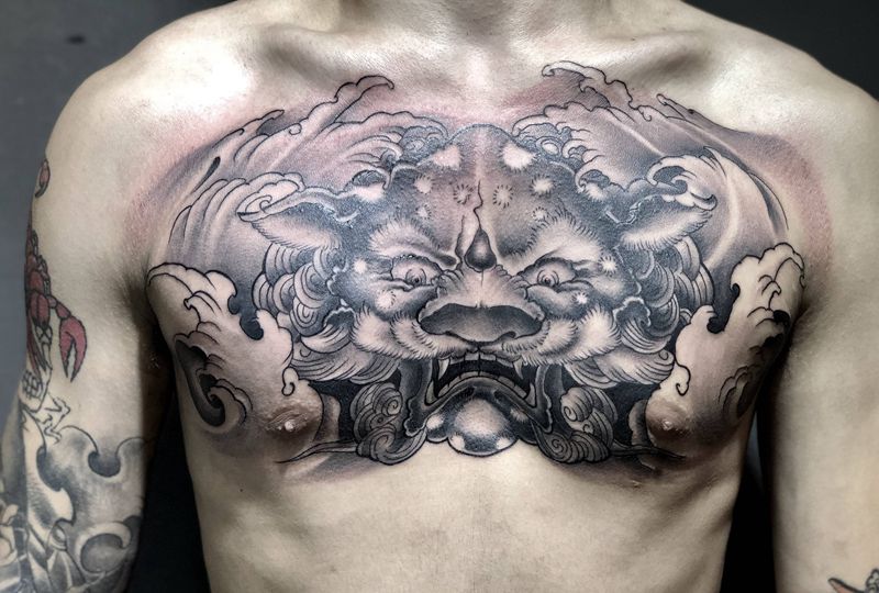 花胸 福狮纹身图片_胸部新传统纹身图案