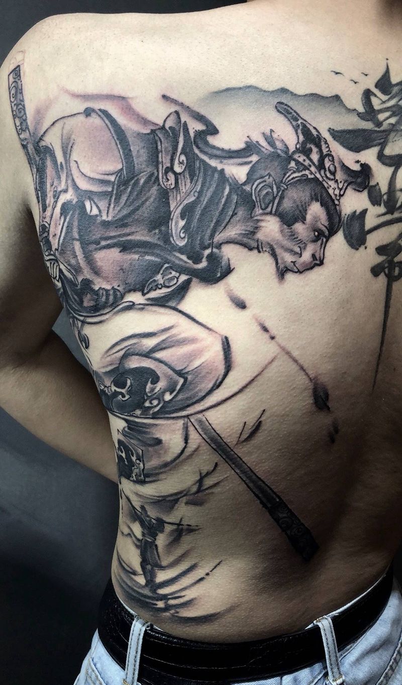 当前位置: 首页 >浙江省丽水市纹身店-逐流刺青纹身图案>孙猴子纹身图片_背部水墨纹身图案