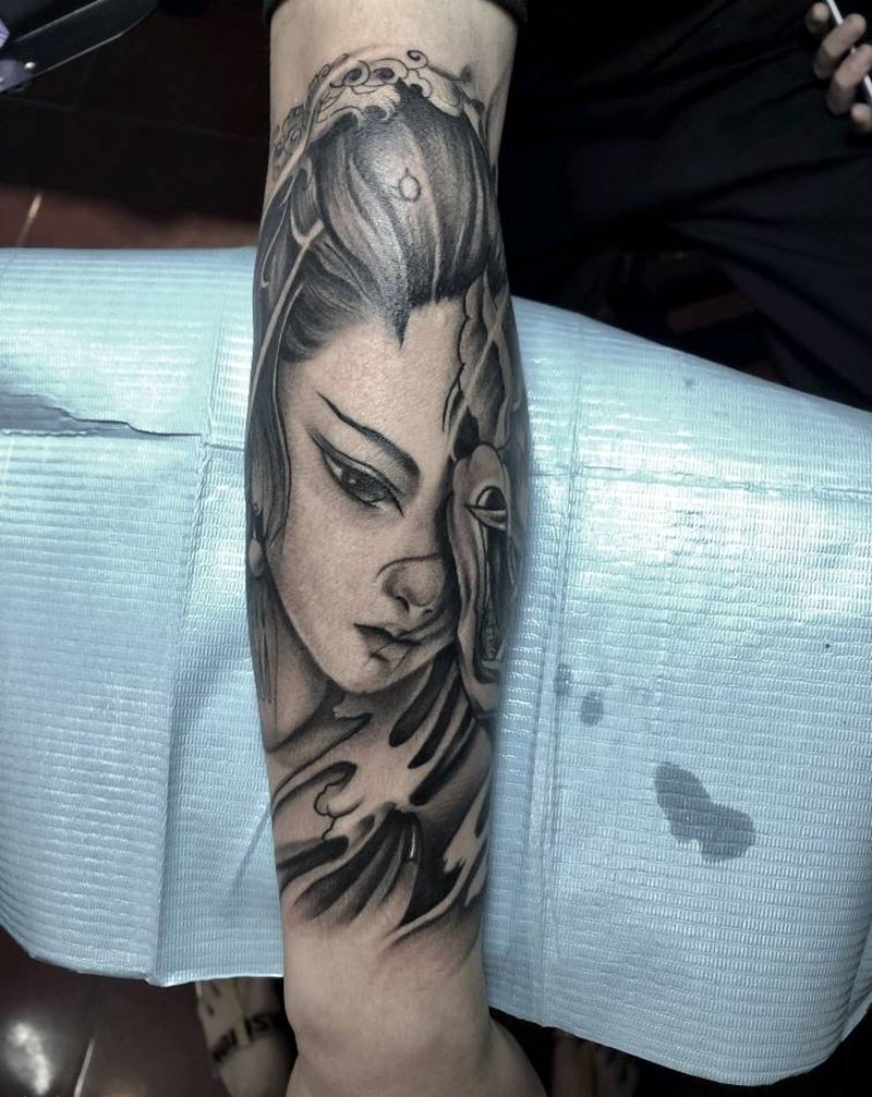 艺伎般若面具纹身图片_手臂新传统纹身图案