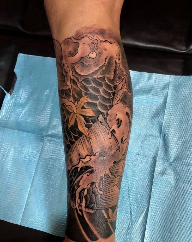 荷花鲤鱼包小腿纹身图片_腿部新传统纹身图案