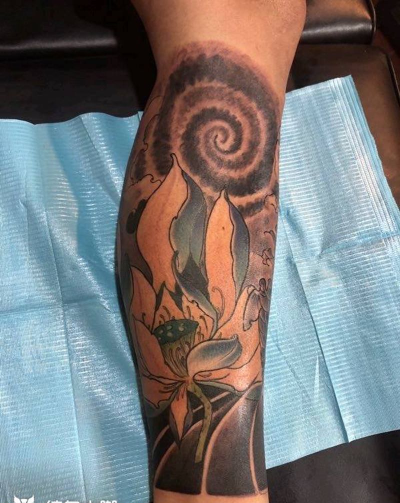 当前位置: 首页 >浙江省丽水市纹身店-逐流刺青纹身图案>荷花鲤鱼包小腿纹身图片_腿部新传统纹身图案