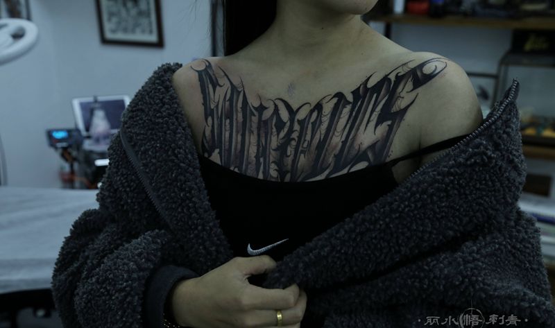 当前位置: 首页 >浙江省丽水市纹身店-悟·刺青工作室纹身图案>花体纹身图片_胸部肩部New School花体字纹身图案
