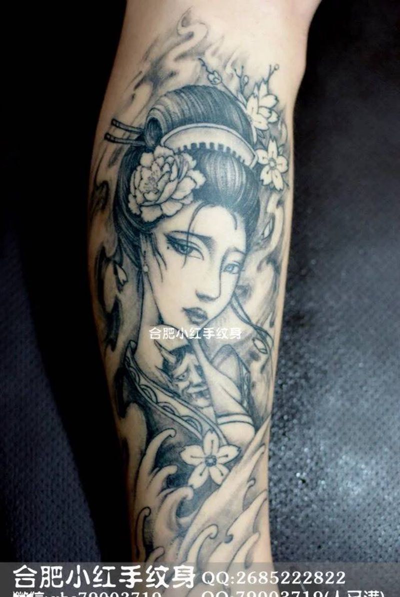 当前位置: 首页 >安徽省合肥市纹身店-小红手纹身工作室纹身图案>小腿艺伎 黑白部分为恢复半年后效果纹身图片