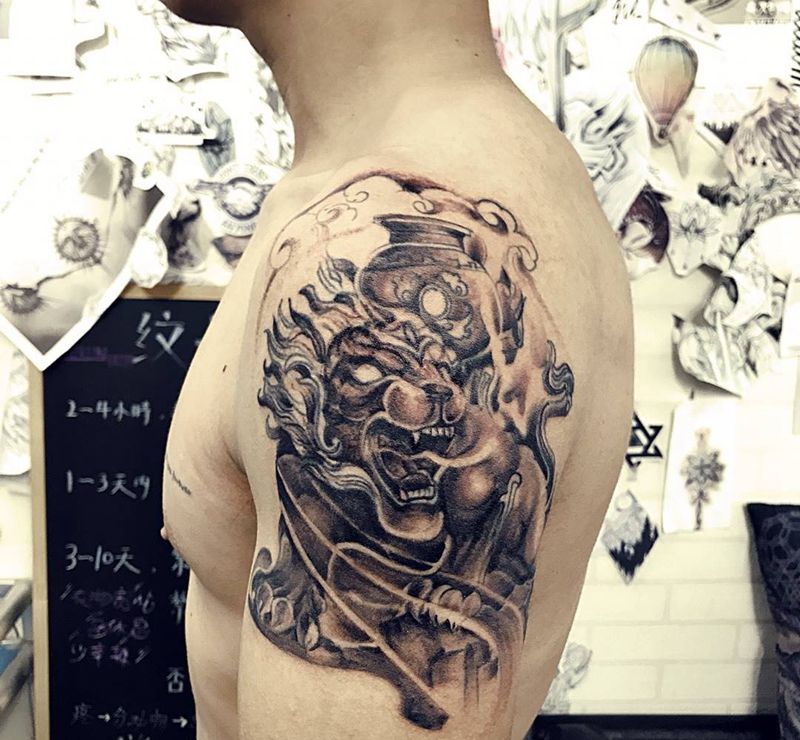当前位置: 首页 >浙江省丽水市纹身店-钰琨纹身工作室纹身图案>旧图上色狻猊纹身图片