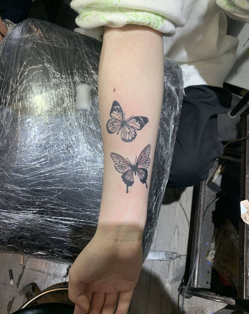 当前位置: 首页 >浙江省丽水市纹身店-金魁刺青纹身图案>福蝶纹身图片_手臂手部欧美写实新传统蝴蝶黑灰小清新纹身图案