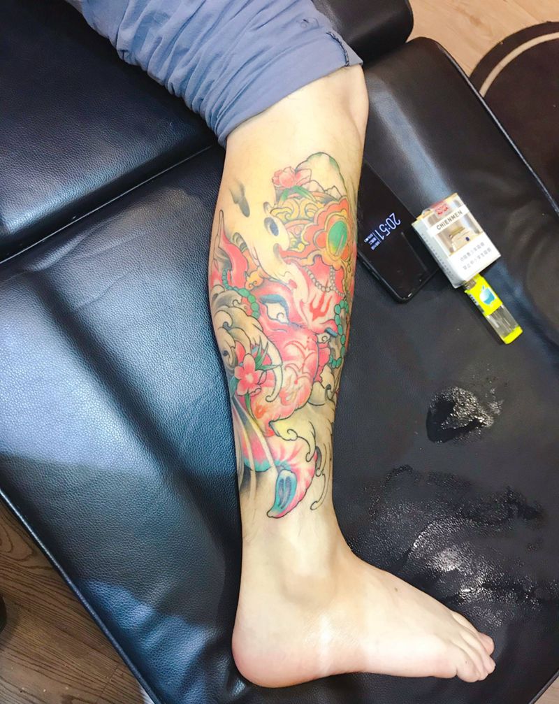 • T网红王老大花腿龙纹身图片_腿部新传统纹身图案