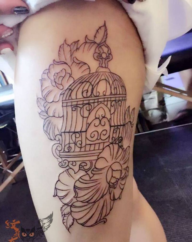 鸟笼、未完成纹身图片_欧美清新静物腿部纹身图案