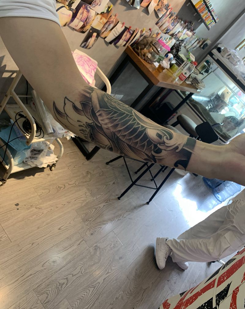 小臂 胳膊肘留着接花臂纹身图片_手臂新传统老传统鱼 小臂 小臂花臂纹身图案