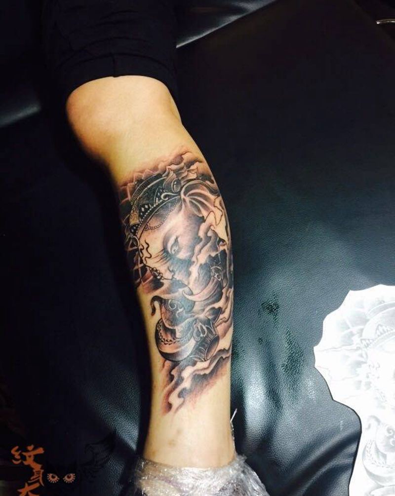象神 象神纹身图片_传统动物宗教腿部纹身图案