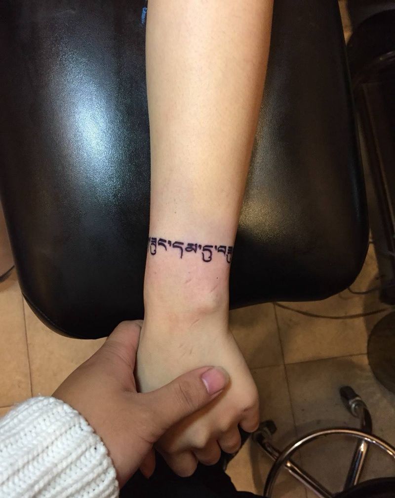当前位置: 首页 >浙江省丽水市纹身店-金魁刺青纹身图案>手腕梵文纹身图片_成品手部手臂清新传统字符宗教纹身图案