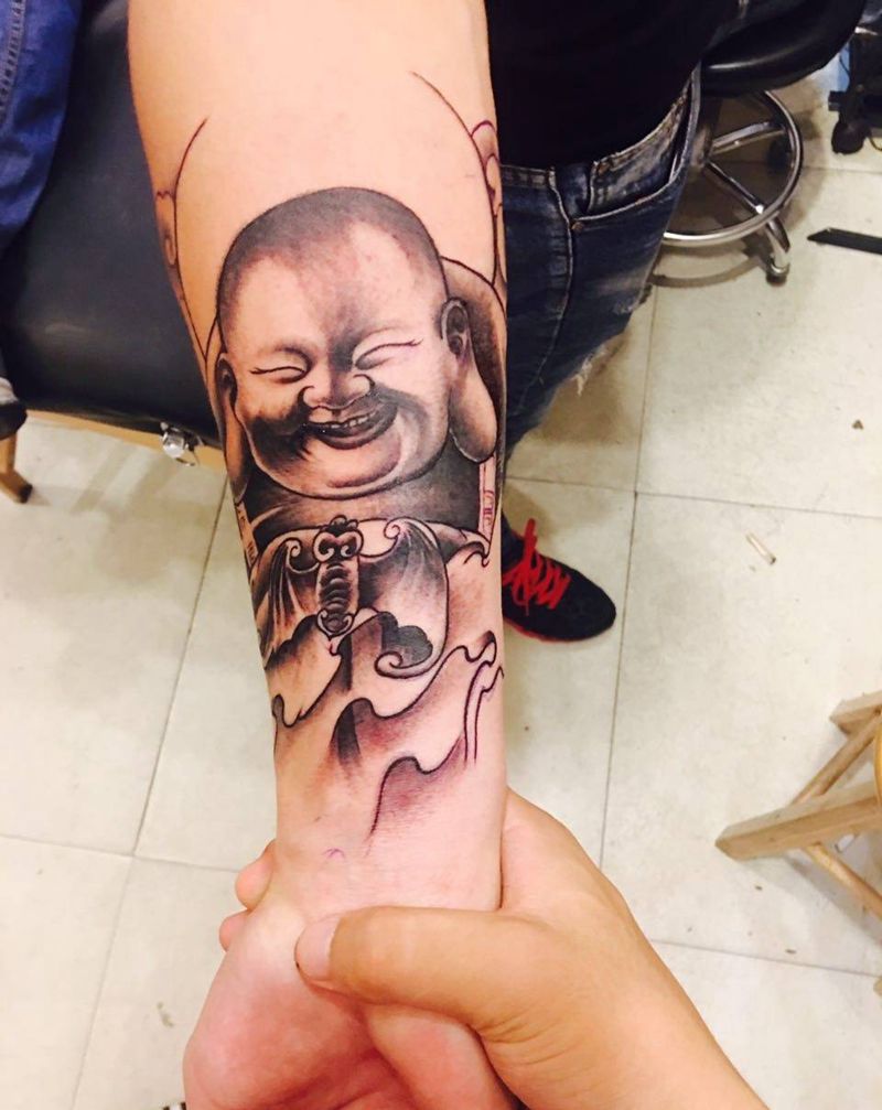 当前位置: 首页 >浙江省丽水市纹身店-金魁刺青纹身图案>笑口常开纹身图片_成品手臂传统肖像国画人物宗教纹身图案