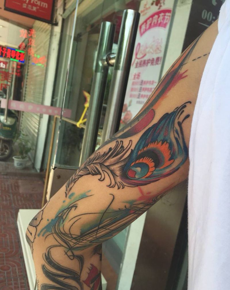 当前位置: 首页 >浙江省丽水市纹身店-金魁刺青纹身图案>孔雀翎纹身图片_手臂成品肩部腰部欧美传统动物静物纹身图案